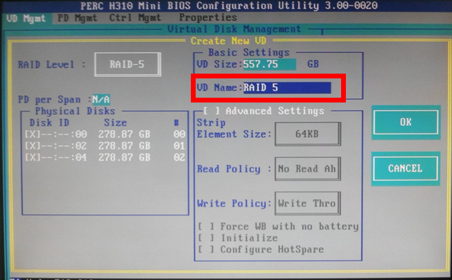 2、进入RAID BIOS看到得第一个界面是VD Mgmt(虚拟磁盘管理,也就是阵列管理),下面显示了检测到得3个300G的SAS硬盘(我们这里以使用3块300G SAS盘为例)。